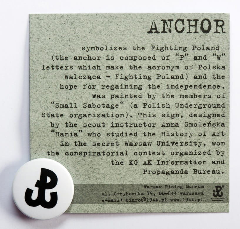Znaczek z symbolem Polski Walczącej (2,5 cm). Do znaczka dołączamy kartkę z informacją historyczną w dwóch językach – polskim i angielskim.
